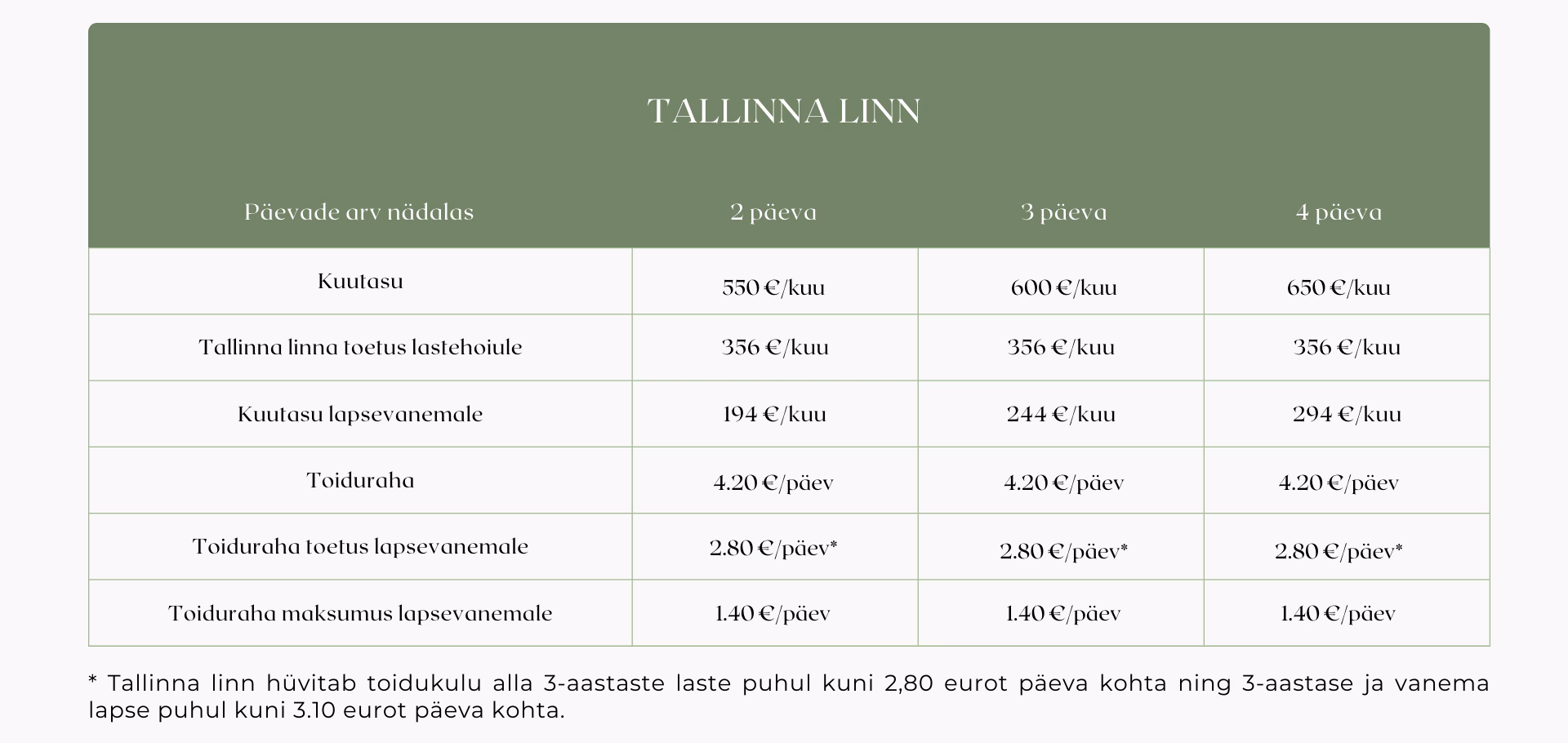 Lastehoiu hinnakiri Lastehoiu hinnakiri Harku valla toetuse tingimused Tallinna linna toetuse tingimused Kiili valla toetuse tingimused Saue valla toetuse tingimused